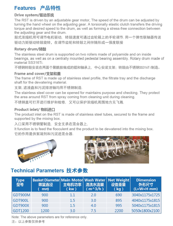 不銹鋼轉(zhuǎn)鼓安裝在兩個(gè)聚酰胺做成的輥和軸承上,中心安裝支架;轉(zhuǎn)鼓由不銹鋼SS316Ti制造。